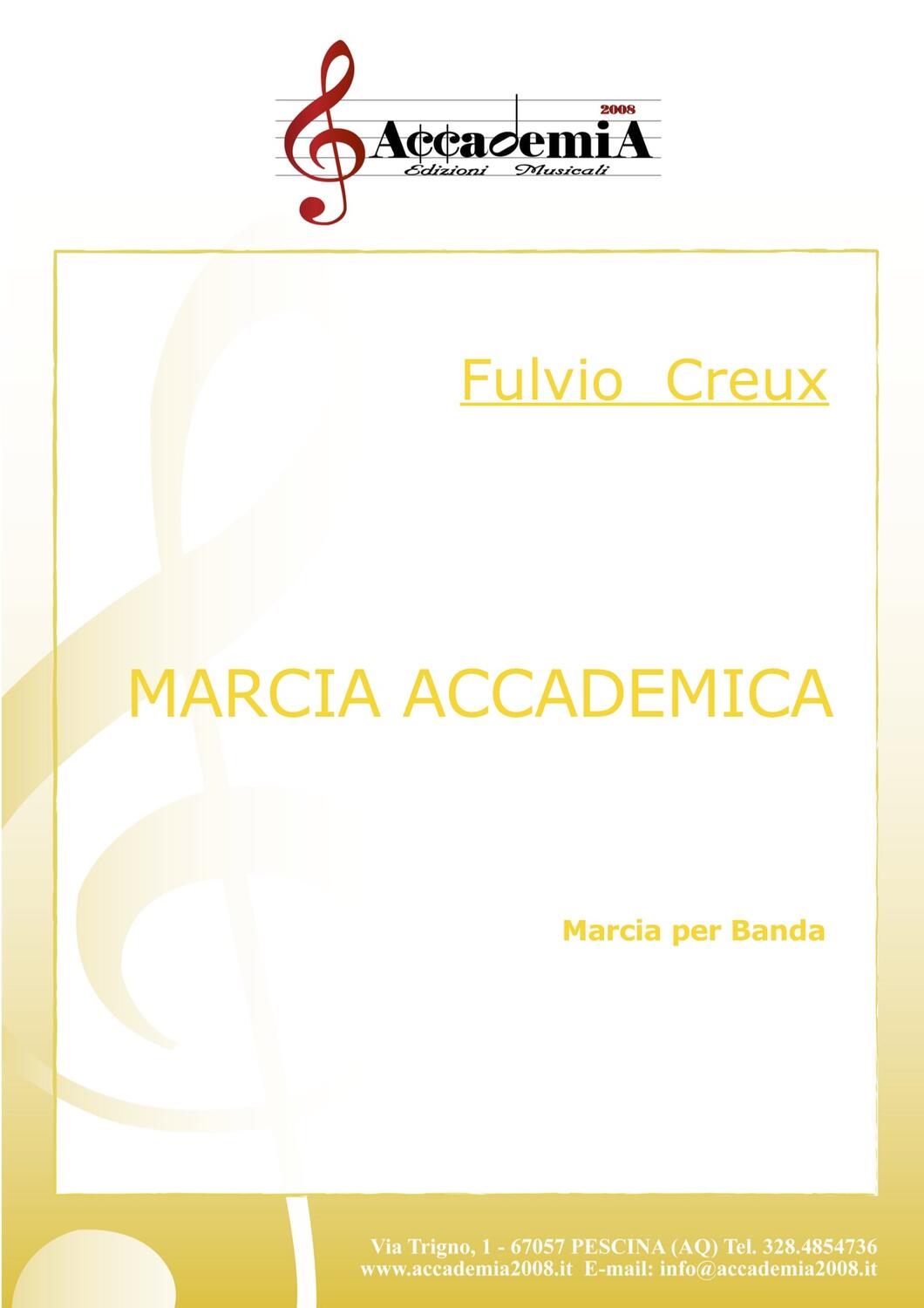 MARCIA ACCADEMICA - Fulvio Creux Brano originale per Banda Parti e partitura in pdf | € 20,00 Cartaceo | € 40,00 €20,00 20,00 Acquista Dedicata alla Orchestra Giovanile di Fiati “N. Spataro” di Delianuova